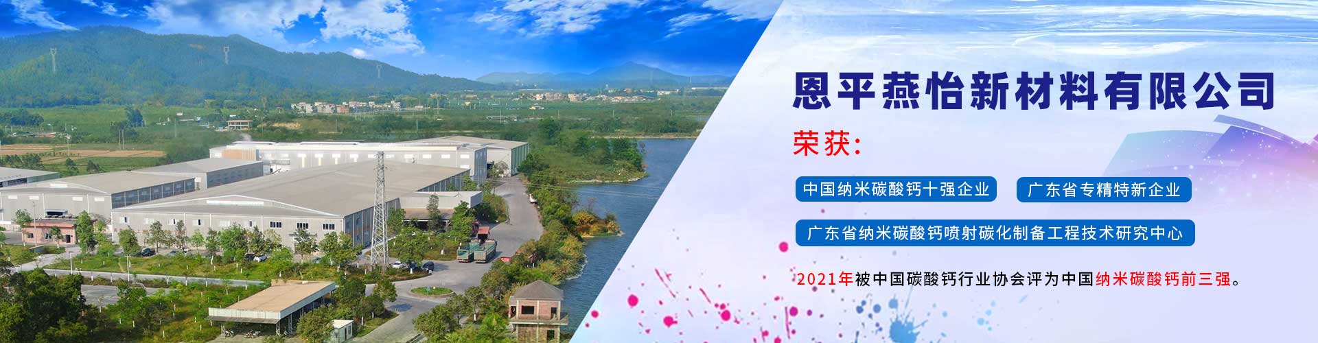恩平燕怡新材料有限公司成立于2006年,位于廣東省江門恩平市。是一家專注于納米碳酸鈣產(chǎn)品研發(fā)、生產(chǎn)以及銷售服務的新材料企業(yè)。 公司榮獲 “高新技術企業(yè)”、 “清潔生產(chǎn)企業(yè)”、“廣東省納米碳酸鈣噴射碳化制備工程技術研究中心” 、 “中國納米碳酸鈣十強企業(yè)” 、 “廣東省專精特新企業(yè)”等稱號,并通過ISO9001:2015質(zhì)量管理體系認證,產(chǎn)品質(zhì)量符合國家行業(yè)標準GB/T19590—2011納米碳酸鈣優(yōu)等品的要求。...